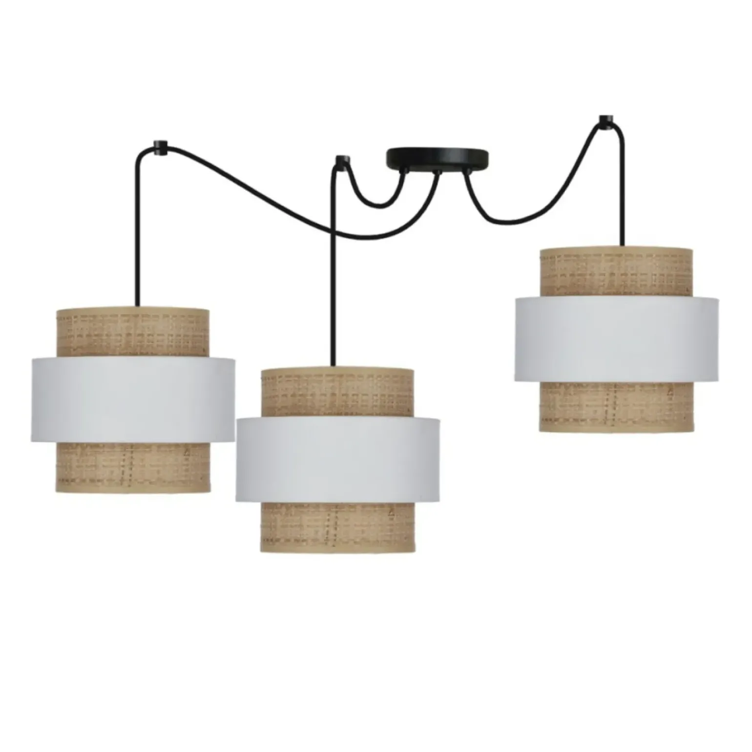 Materiał: zawiesie stalowe, abażur tkanina/PCV+ratan