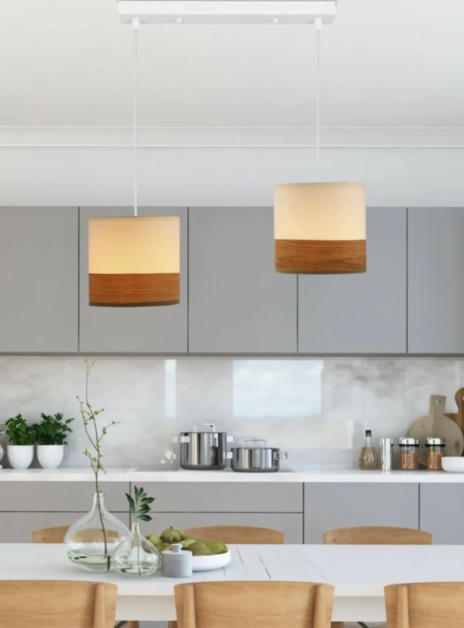 Materiał: zawiesie stalowe, abażur tkanina+fornir