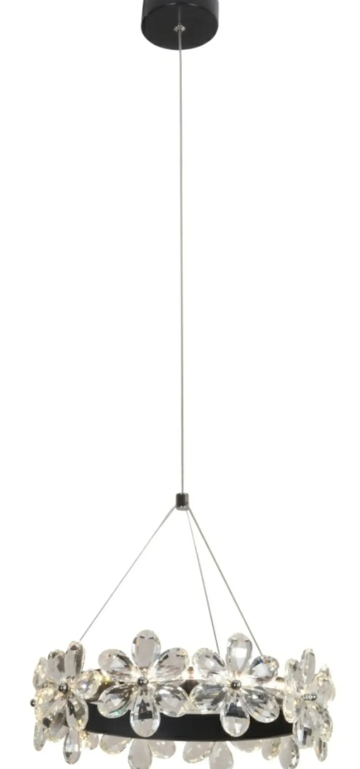 Materiał: stal, zawiesie stalowe na linkach, ozdoby szklane