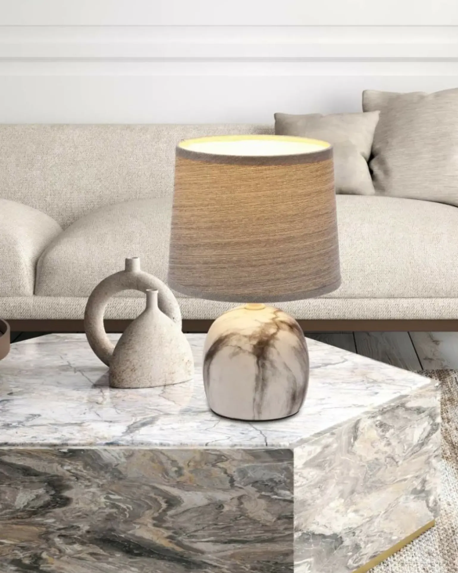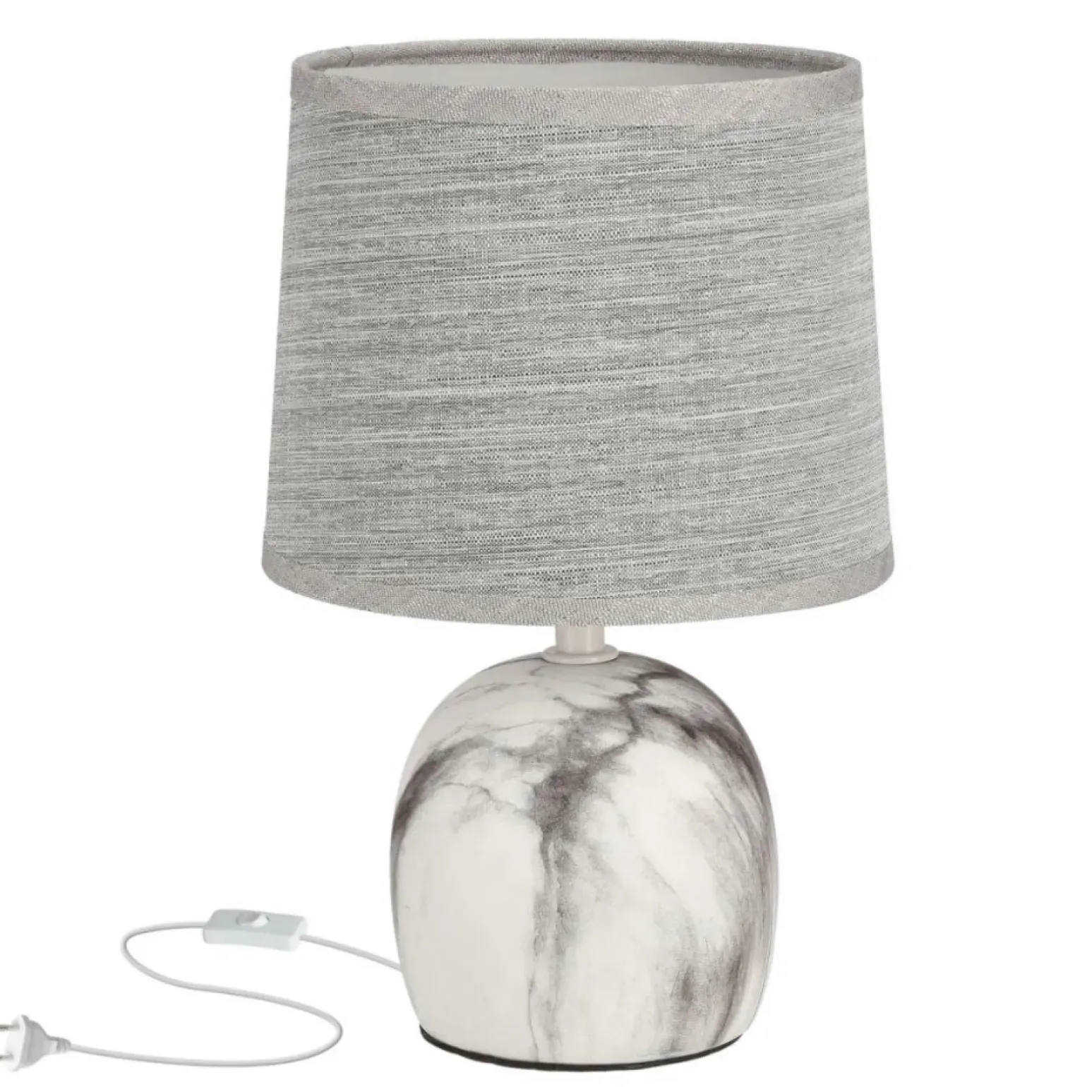 Materiał: podstawa ceramiczna, abażur tkanina+PCV